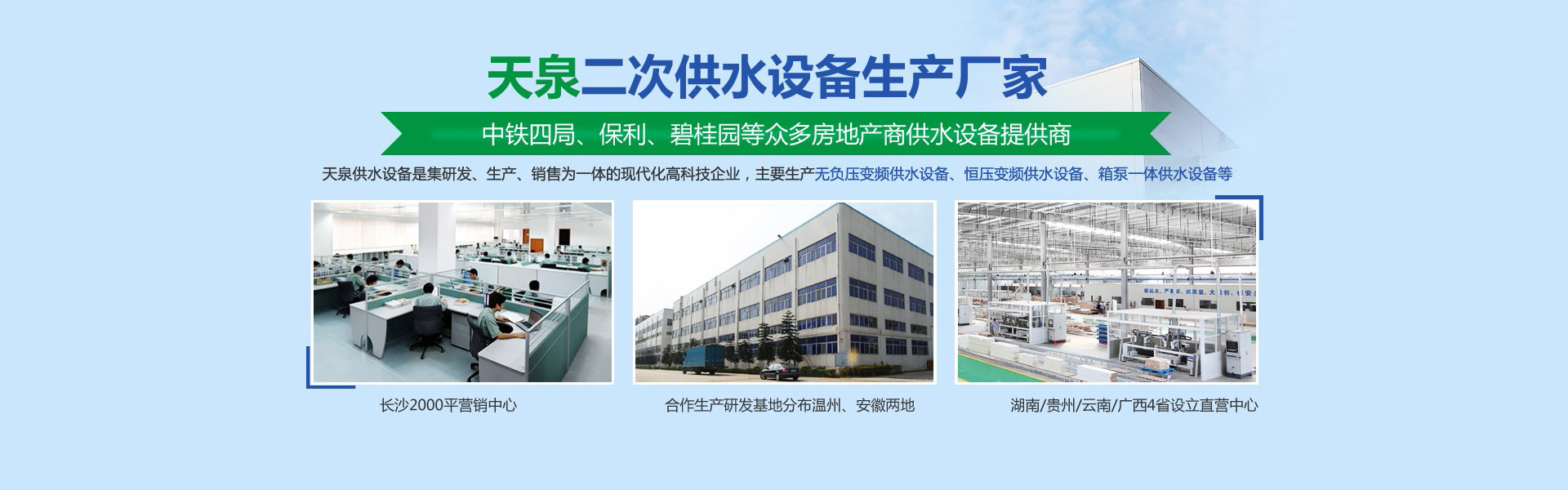 長沙天泉供水設(shè)備有限公司位于長沙雨花經(jīng)濟開發(fā)區(qū)。公司是集研發(fā)、生產(chǎn)、銷售為一體的現(xiàn)代化科技型企業(yè)公司生產(chǎn)銷售的產(chǎn)品有無負壓變頻供水設(shè)備、自來水加壓泵站、變頻調(diào)速恒壓供水設(shè)備、智慧標準泵房、智慧水務(wù)、一體化預(yù)制泵站、循環(huán)水系統(tǒng)工程等二十幾大類別。